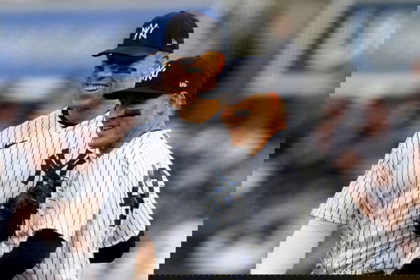 NEW YORK, NEW YORK – OCTOBER 22: Aaron Judge #99 and Anthony Rizzo #48 of the New York Yankees react after the first out was recorded against the Houston Astros during the second inning in game three of the American League Championship Series at Yankee Stadium on October 22, 2022 in New York City. (Photo by Elsa/Getty Images)