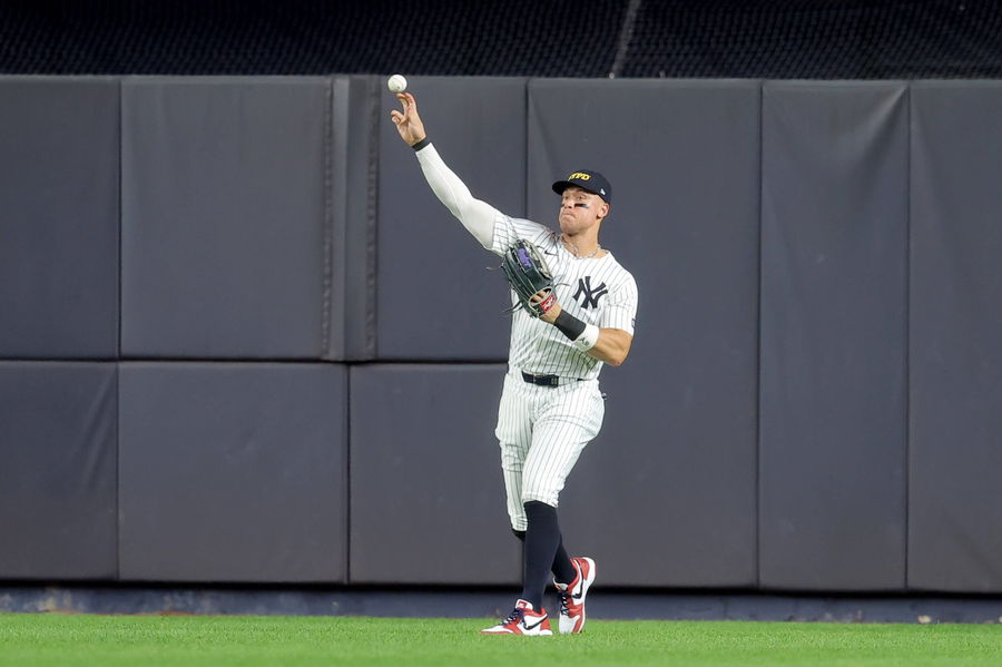 MLB, Baseball Herren, USA Detroit Tigers at New York Yankees Sep 11, 2025; Bronx, New York, USA; New York Yankees right fielder Aaron Judge (99) throws the ball in after a triple by Detroit Tigers shortstop Javier Baez (not pictured) during the ninth inning at Yankee Stadium. Bronx Yankee Stadium New York USA, EDITORIAL USE ONLY Copyright: xBradxPennerx 20250911_bjp_ae5_036