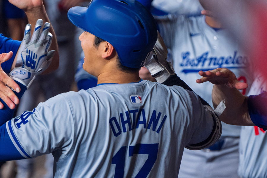 Aug 30, 2024; Phoenix, Arizona, USA; Los Angeles Dodgers designated hitter Shohei Ohtani (17) reacts after hitting a solo home run in the eighth inning during a game against the Arizona Diamondbacks at Chase Field. Mandatory Credit: Allan Henry-USA TODAY Sports