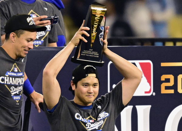 Los Angeles Dodgers Shohei Ohtani holds his trophy after being named the 2025 NLCS MVP after the Dodgers beat the Milwaukee Brewers 5-1 to win the MLB, Baseball Herren, USA National League Championship Series at Dodger Stadium in Los Angeles, California, on Friday, October 17, 2025. The Dodgers won the best-of-seven Championship series 4-0 and advance to the World Series. PUBLICATIONxNOTxINxUSA LOS20251017934 JOHNxMCCOY