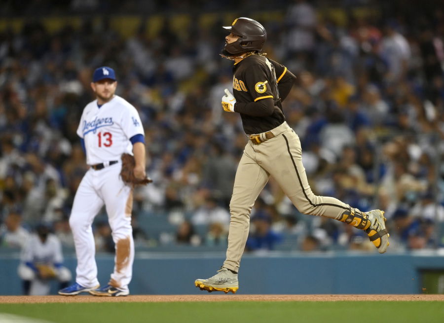 Sep 30, 2021; Los Angeles, California, USA; San Diego Padres shortstop Fernando Tatis Jr. (23) rounds the bases after hitting a solo home run in the fifth inning of the game against the Los Angeles Dodgers at Dodger Stadium. Mandatory Credit: Jayne Kamin-Oncea-USA TODAY Sports