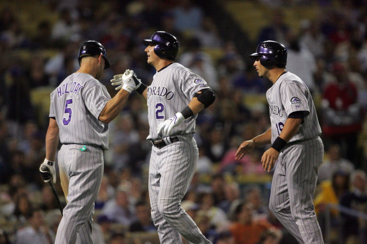 MLB, Baseball Herren, USA Colorado Rockies at Los Angeles Dodgers September 25, 2007 Los Angeles CA, USA Colorado Rockies shortstop Troy Tulowitzki 2 is congratulated by leftfielder Matt Holiday 5 and outfielder Ryan Spilborghs 19 after hitting a two run homer in the sixth inning against the Los Angeles Dodgers at Dodger Stadium. Los Angeles California UNITED STATES, EDITORIAL USE ONLY PUBLICATIONxINxGERxSUIxAUTxONLY Copyright: xGaryxA.xVasquez-USAxTODAYxSportsx 2233107