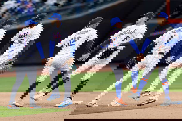 NEW YORK, NEW YORK – APRIL 08: Jeff McNeil #1, Starling Marte #6, Francisco Lindor #12, and Brandon Nimmo #9 of the New York Mets celebrate during the ninth inning against the Miami Marlins at Citi Field on April 08, 2023 in the Flushing neighborhood of the Queens borough of New York City. The Mets won 5-2. (Photo by Sarah Stier/Getty Images)