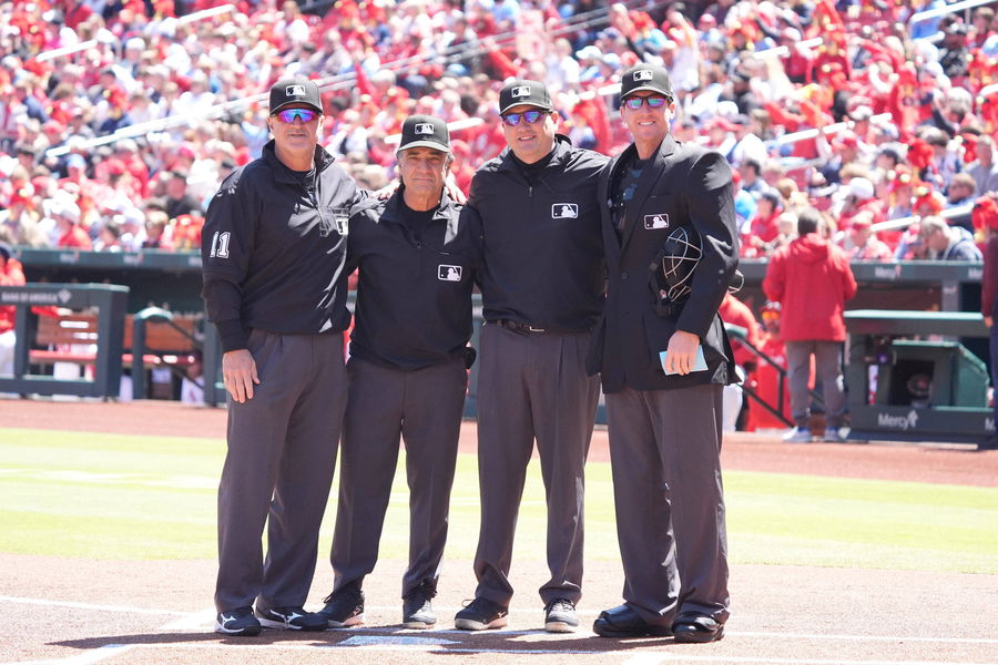 Major League umpires L to R Tony Randazzo, Phil Cuzzi, Dan Bellino and home plate umpire Alex Tosi gather at home plate for a photo before the start of the Milwaukee Brewers-St. Louis Cardinals baseball game at Busch Stadium in St. Louis on Sunday, April 21, 2024. PUBLICATIONxINxGERxSUIxAUTxHUNxONLY SLP2024042101 BILLxGREENBLATT