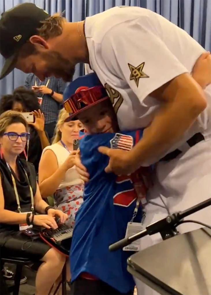 Blake Grice, 10, got a credential for the All-Star game to pursue his media career — and check off something from his late grandfather, Graham’s bucket list: meet Clayton Kershaw.