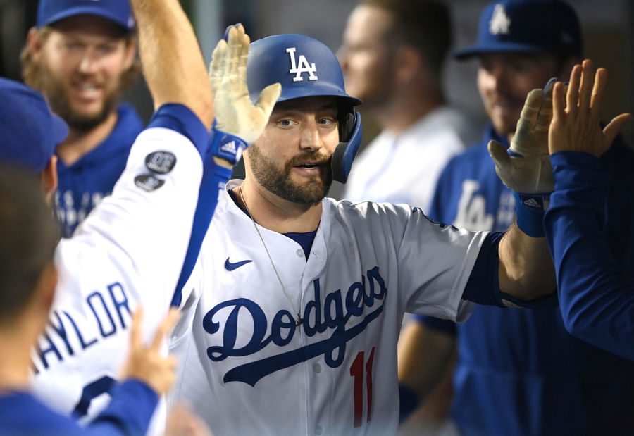 Sep 30, 2021; Los Angeles, California, USA; Los Angeles Dodgers left fielder AJ Pollock (11) is greeted in the dugout after hitting a solo home run in the fourth inning of the game against the San Diego Padres at Dodger Stadium. Mandatory Credit: Jayne Kamin-Oncea-USA TODAY Sports