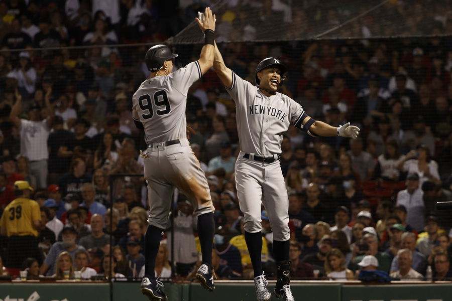 Sep 24, 2021; Boston, Massachusetts, USA; New York Yankees designated hitter Giancarlo Stanton (27) celebrates his three run home run against the Boston Red Sox with right fielder Aaron Judge (99) during the third inning at Fenway Park. Mandatory Credit: Winslow Townson-USA TODAY Sports