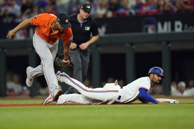Oct 23, 2023; Houston, Texas, USA; Texas Rangers right fielder Adolis Garcia (53) hits a home run during the third inning of game seven in the ALCS against the Houston Astros for the 2023 MLB playoffs at Minute Maid Park. Mandatory Credit: Erik Williams-USA TODAY Sports