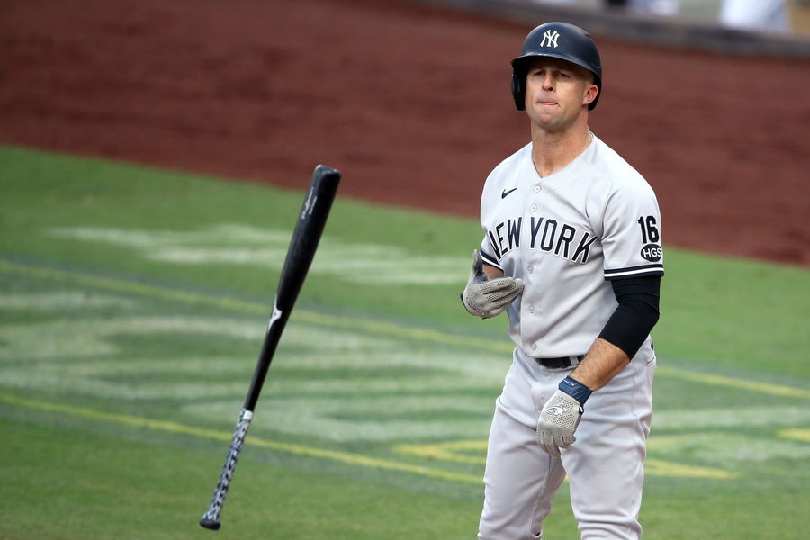 SAN DIEGO, CALIFORNIA – OCTOBER 09: Brett Gardner #11 of the New York Yankees reacts after drawing a walk against the Tampa Bay Rays during the third inning in Game Five of the American League Division Series at PETCO Park on October 09, 2020 in San Diego, California. (Photo by Christian Petersen/Getty Images)