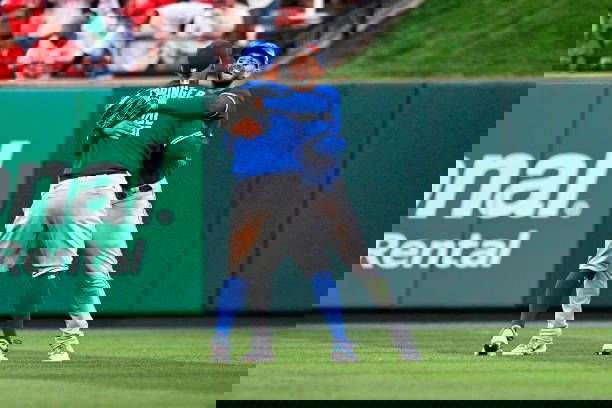 ST LOUIS, MO – MARCH 30: George Springer #4 and Kevin Kiermaier #39 of the Toronto Blue Jays celebrate their teams 10-9 victory over the St. Louis Cardinals on Opening Day at Busch Stadium on March 30, 2023 in St Louis, Missouri. (Photo by Joe Puetz/Getty Images)