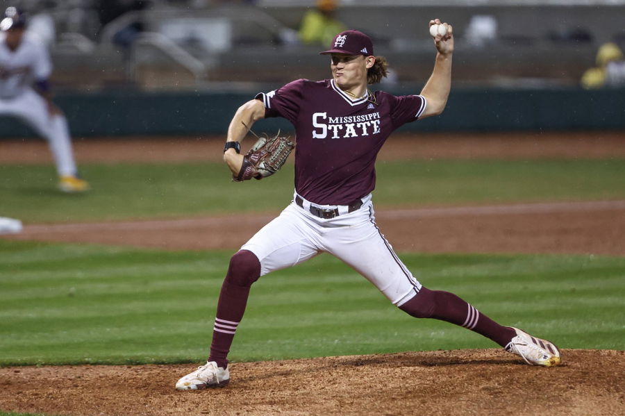 NCAA, College League, USA Baseball 2025: Mississippi St. Vs LSU MAR 28 March 28, 2025: Mississippi St. starting pitcher Pico Kohn (9) delivers a pitch to the plate during NCAA Baseball action between the Mississippi State Bulldogs and the LSU Tigers at Alex Box Stadium, Skip Bertman Field in Baton Rouge, LA. Jonathan Mailhes CSM (Credit Image: Jonathan Mailhes Cal Media) Baton Rouge La USA EDITORIAL USE ONLY Copyright: xx ZUMA-20250328_zma_c04_465.jpg Jonathan Mailhes csmphotothree370485