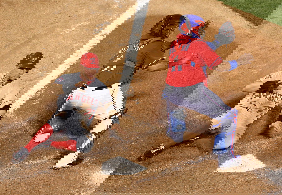 MLB, Baseball Herren, USA Los Angeles Angels at Texas Rangers Oct 1, 2010 Arlington, TX, USA Los Angeles Angels pinch runner Reggie Willits 77 scores in the eighth inning against Texas Rangers catcher Bengie Molina 11 at Rangers Ballpark. Arlington Texas UNITED STATES, EDITORIAL USE ONLY PUBLICATIONxINxGERxSUIxAUTxONLY Copyright: xMatthewxEmmons-USAxTODAYxSportsx 4871494