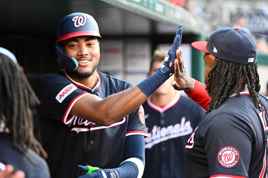 MLB, Baseball Herren, USA Detroit Tigers at Washington Nationals Jul 3, 2025; Washington, District of Columbia, USA; Washington Nationals left fielder James Wood (29) is congratulated by teammates after hitting a solo home run against the Detroit Tigers during the second inning at Nationals Park. Washington Nationals Park District of Columbia USA, EDITORIAL USE ONLY Copyright: xBradxMillsx 20250703_dbm_au3_019