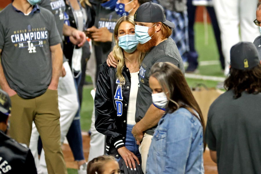 Oct 27, 2020; Arlington, Texas, USA; Los Angeles Dodgers third baseman Justin Turner (10) poses for a picture with his wife Kourtney Pogue after the Los Angeles Dodgers beat the Tampa Bay Rays to win the World Series in game six of the 2020 World Series at Globe Life Field. Mandatory Credit: Kevin Jairaj-USA TODAY Sports