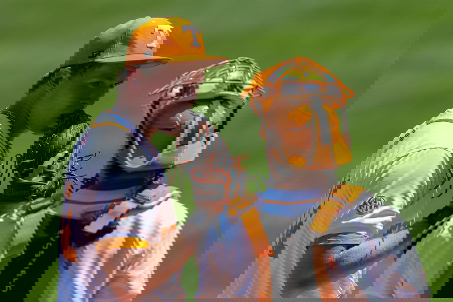 June 8, 2025: Tennessee catcher Cannon Peebles 5 has a discussion with pitcher Liam Doyle 12 on the mound. .Arkansas defeated Tennessee 11-4 in Fayetteville, AR. /CSM Fayetteville USA – ZUMAcm9_ 20250608_faf_cm9_076 Copyright: xRicheyxMillerx