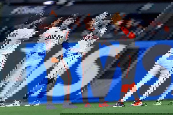 MLB, Baseball Herren, USA Arizona Diamondbacks at San Francisco Giants Sep 8, 2025 San Francisco, California, USA San Francisco Giants center fielder Jung Hoo Lee 51 and left fielder Heliot Ramos 17 and right fielder Luis Matos 29 celebrate after the game against the Arizona Diamondbacks at Oracle Park. San Francisco Oracle Park California USA, EDITORIAL USE ONLY PUBLICATIONxINxGERxSUIxAUTxONLY Copyright: xNevillexE.xGuardx 20250908_lbm_gb7_217