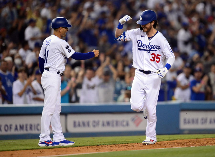 Aug 7, 2021; Los Angeles, California, USA; Los Angeles Dodgers center fielder Cody Bellinger (35) is greeted by third base coach Dino Ebel (91) after hitting a solo home run against the Los Angeles Angels during the seventh inning at Dodger Stadium. Mandatory Credit: Gary A. Vasquez-USA TODAY Sports