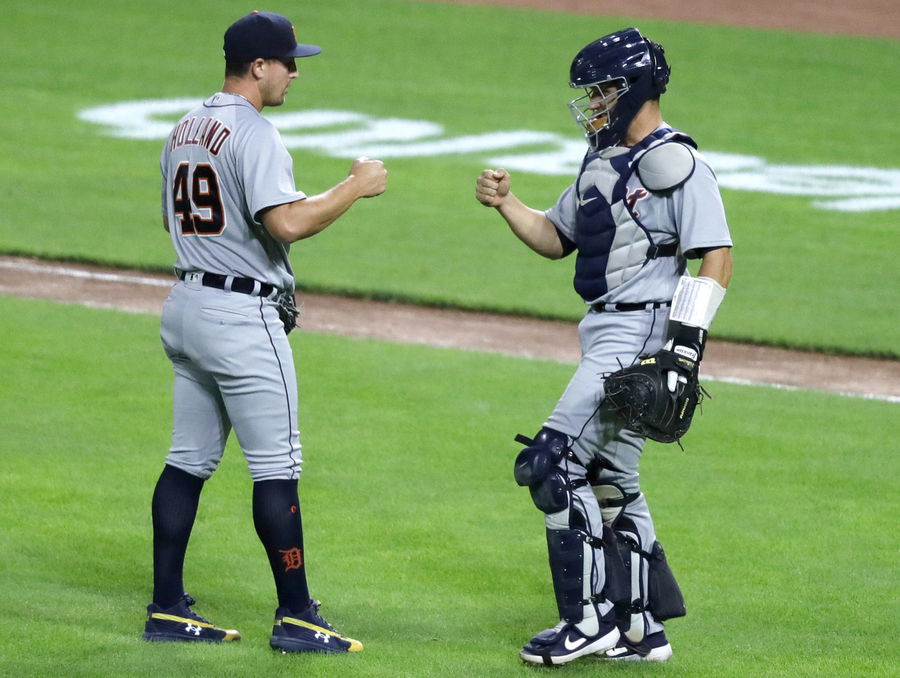 Sep 3, 2021; Cincinnati, Ohio, USA; Detroit Tigers pitcher Derek Holland (49 and catcher Dustin Garneau (64) react after defeating the Cincinnati Reds at Great American Ball Park. Mandatory Credit: David Kohl-USA TODAY Sports