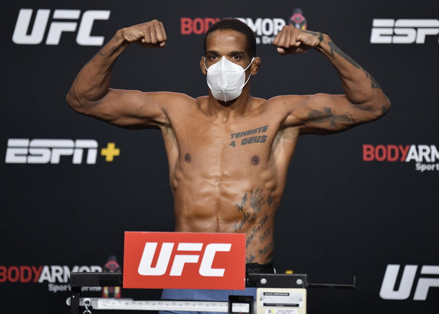 LAS VEGAS, NEVADA – SEPTEMBER 11: Alan Patrick of Brazil poses on the scale during the UFC Fight Night weigh-in at UFC APEX on September 11, 2020, in Las Vegas, Nevada. (Photo by Jeff Bottari/Zuffa LLC)