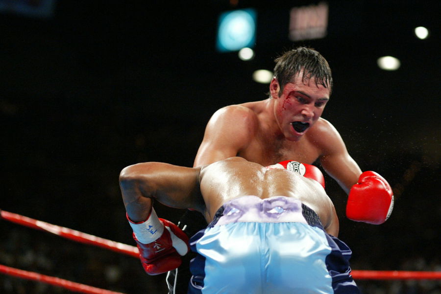 Shane Mosley, blue trunks, fights Oscar De La Hoya, black trunks, during a 12-round WBC/WBA Super Welterweight Championship bout (154lbs) held a the MGM Grand Garden Arena in Las Vegas, NV on Saturday September 13, 2003. Shane Mosely wins by unanimous decision. (Photo by Chris Polk/Getty Images)