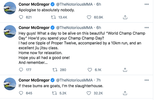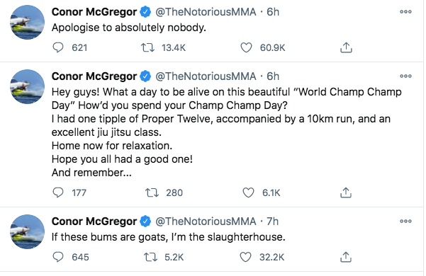 Hope you all had a great day ❤️— Conor McGregor (@TheNotoriousMMA) November 13, 2020