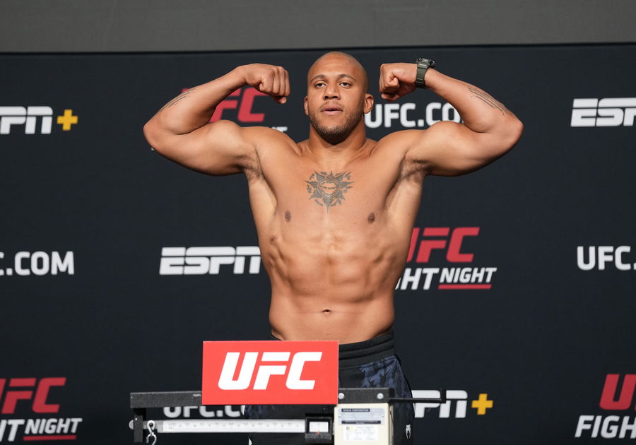 LAS VEGAS, NV – JUNE 25: Ciryl Gane steps on the scale for the official weigh-in for UFC Vegas 30 on June 25, 2021, at UFC Apex in Las Vegas, NV. (Photo by Louis Grasse/PxImages/Icon Sportswire via Getty Images)