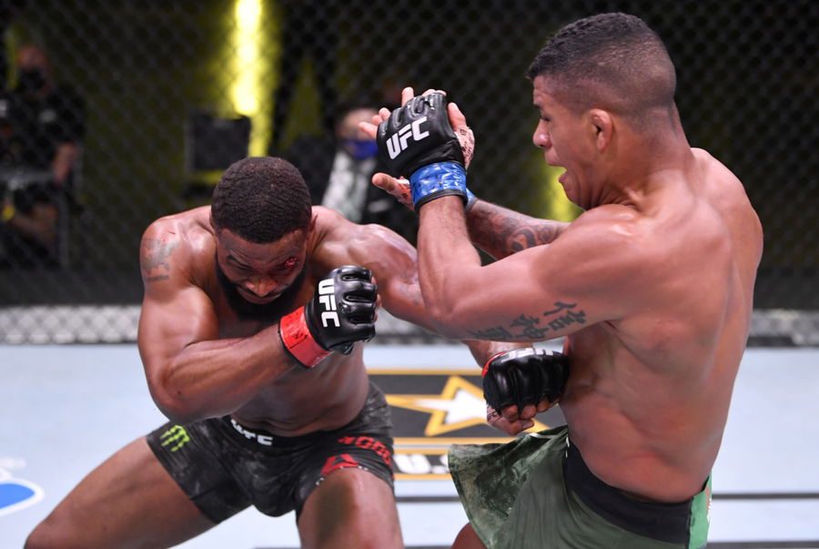 LAS VEGAS, NEVADA – MAY 30: Tyron Woodley battles Gilbert Burns in a welterweight bout during the UFC Fight Night event at UFC APEX on May 30, 2020 in Las Vegas, Nevada. (Photo by Jeff Bottari/Zuffa LLC)