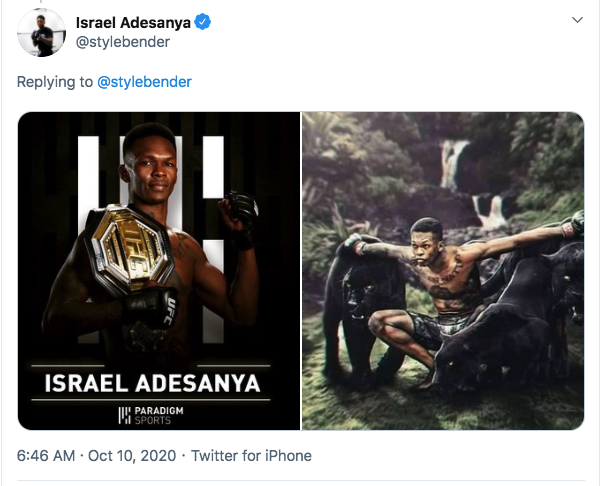 I’m backed by the best! #GPizzle pic.twitter.com/NanHQYJ06D— Israel Adesanya (@stylebender) October 10, 2020