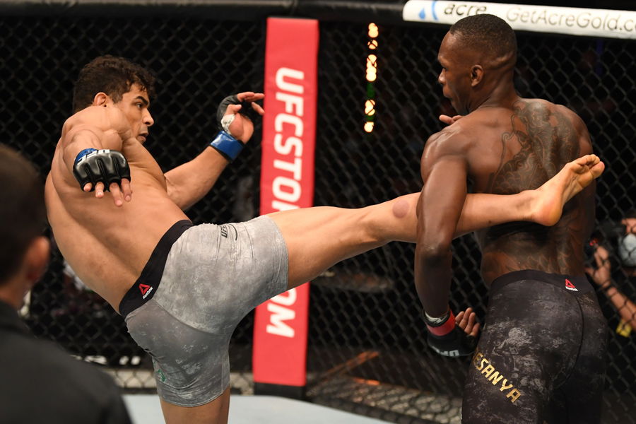 ABU DHABI, UNITED ARAB EMIRATES – SEPTEMBER 27: (L-R) Paulo Costa of Brazil kicks Israel Adesanya of Nigeria in their middleweight championship bout during UFC 253 inside Flash Forum on UFC Fight Island on September 27, 2020 in Abu Dhabi, United Arab Emirates. (Photo by Josh Hedges/Zuffa LLC)