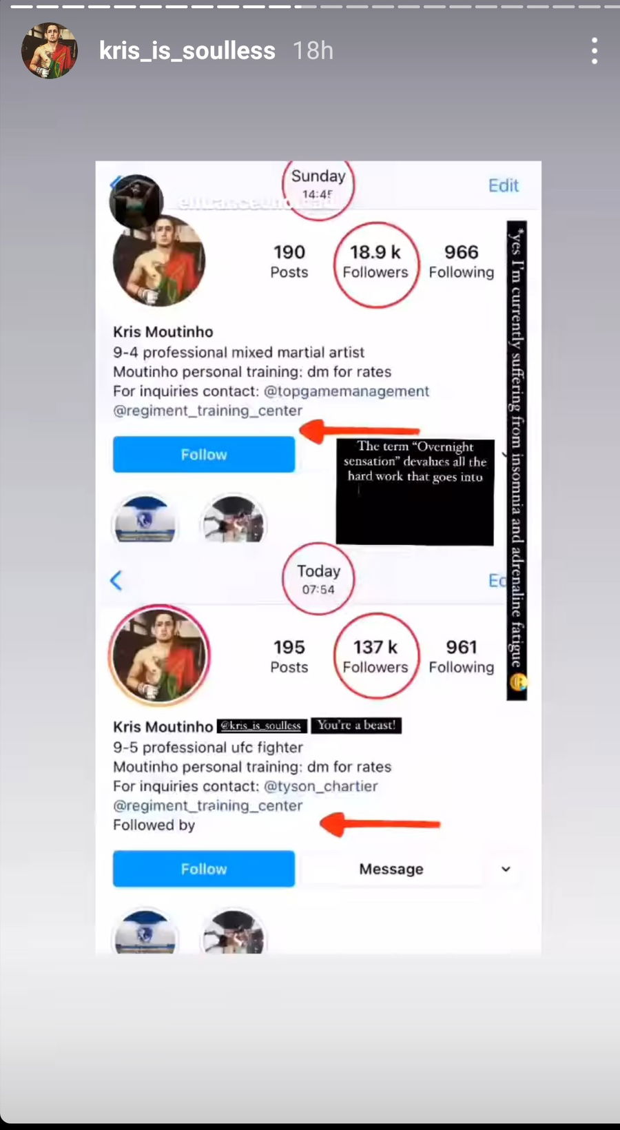 Recently, he put up a status on his Instagram account and showed the difference in followers he has gained after his last fight. Last Sunday noon, he had around 18.9k followers that turned into 137k almost a week later. It shows the amount of appreciation he has received after his valiant effort.