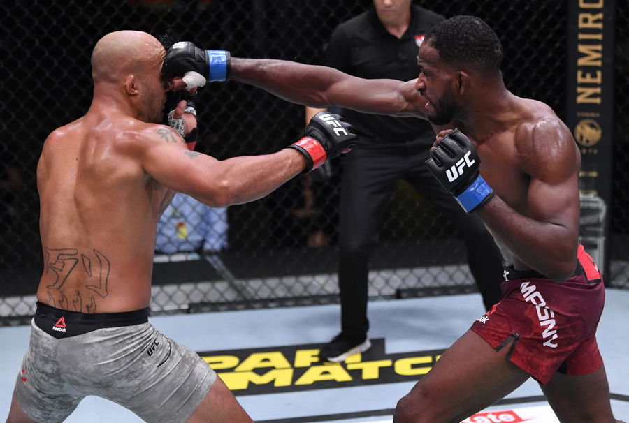 LAS VEGAS, NEVADA – AUGUST 29: (R-L) Neil Magny punches Robbie Lawler in their welterweight fight during the UFC Fight Night event at UFC APEX on August 29, 2020 in Las Vegas, Nevada. (Photo by Jeff Bottari/Zuffa LLC)