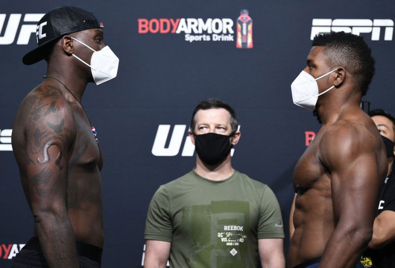 LAS VEGAS, NEVADA – AUGUST 21: (L-R) Opponents Ovince Saint Preux and Alonzo Menifield face off during the UFC Fight Night weigh-in at UFC APEX on August 21, 2020 in Las Vegas, Nevada. (Photo by Chris Unger/Zuffa LLC)