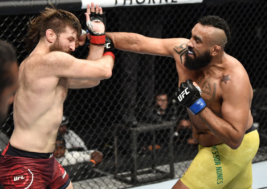 ABU DHABI, UNITED ARAB EMIRATES – JULY 26: (R-L) Raphael Pessoa of Brazil punches Tanner Boser of Canada in their heavyweight fight during the UFC Fight Night event inside Flash Forum on UFC Fight Island on July 26, 2020 in Yas Island, Abu Dhabi, United Arab Emirates. (Photo by Jeff Bottari/Zuffa LLC via Getty Images)