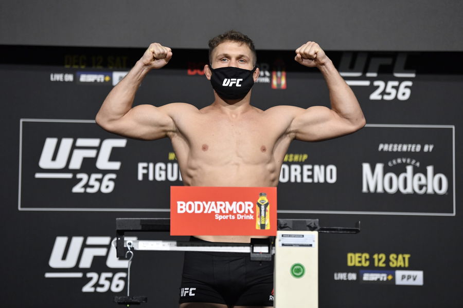 LAS VEGAS, NEVADA – DECEMBER 11: Rafael Fiziev of Kyrgyzstan poses on the scale during the UFC 256 weigh-in at UFC APEX on December 11, 2020 in Las Vegas, Nevada. (Photo by Jeff Bottari/Zuffa LLC via Getty Images)