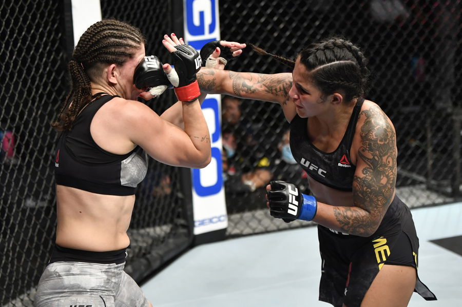 ABU DHABI, UNITED ARAB EMIRATES – JULY 12: (R-L) Vanessa Melo of Brazil punches Karol Rosa of Brazil in their bantamweight fight during the UFC 251 event at Flash Forum on UFC Fight Island on July 12, 2020 on Yas Island, Abu Dhabi, United Arab Emirates. (Photo by Jeff Bottari/Zuffa LLC)