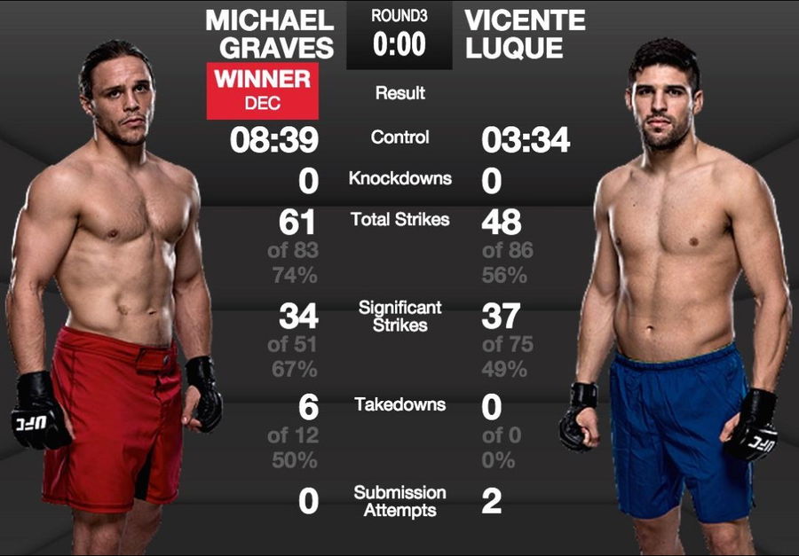 Graves started the fight with his focus on the takedown. He gets one and mounts over Luque, but nothing much happens there. Some exchange punches before Graves ducks down a punch and scores another takedown. Luque tries hard and eventually gets up before being brought down by Graves again. The round ends with Graves on top.