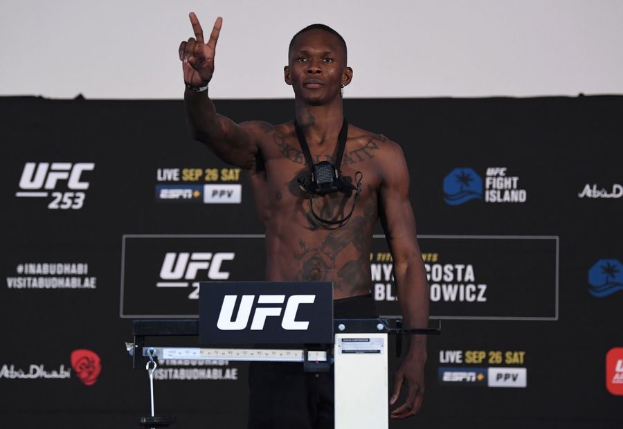 ABU DHABI, UNITED ARAB EMIRATES – SEPTEMBER 25: Israel Adesanya of Nigeria poses on the scale during the UFC 253 weigh-in on September 25, 2020 at Flash Forum on UFC Fight Island, Abu Dhabi, United Arab Emirates. (Photo by Josh Hedges/Zuffa LLC via Getty Images)