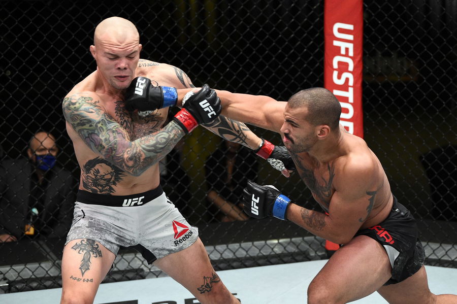 LAS VEGAS, NEVADA – NOVEMBER 28: (R-L) Devin Clark punches Anthony Smith in their light heavyweight bout during the UFC Fight Night at UFC APEX on November 28, 2020 in Las Vegas, Nevada. (Photo by Chris Unger/Zuffa LLC)