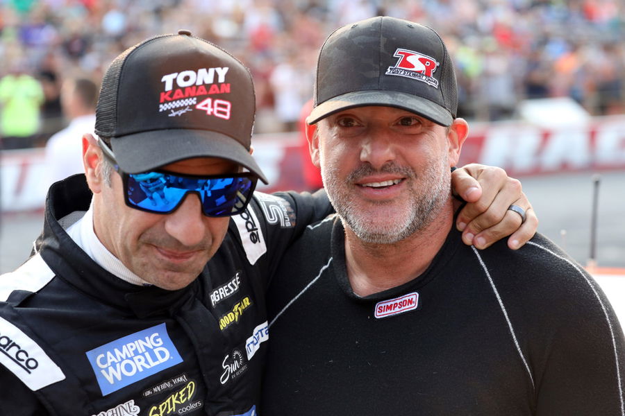 INDIANAPOLIS, INDIANA – JULY 03: (L-R) Tony Kanaan #48 and Tony Stewart #14 talk on the grid prior to the Camping World Superstar Racing Experience event at Lucas Oil Raceway on July 03, 2021 in Indianapolis, Indiana. (Photo by Dylan Buell/SRX via Getty Images)