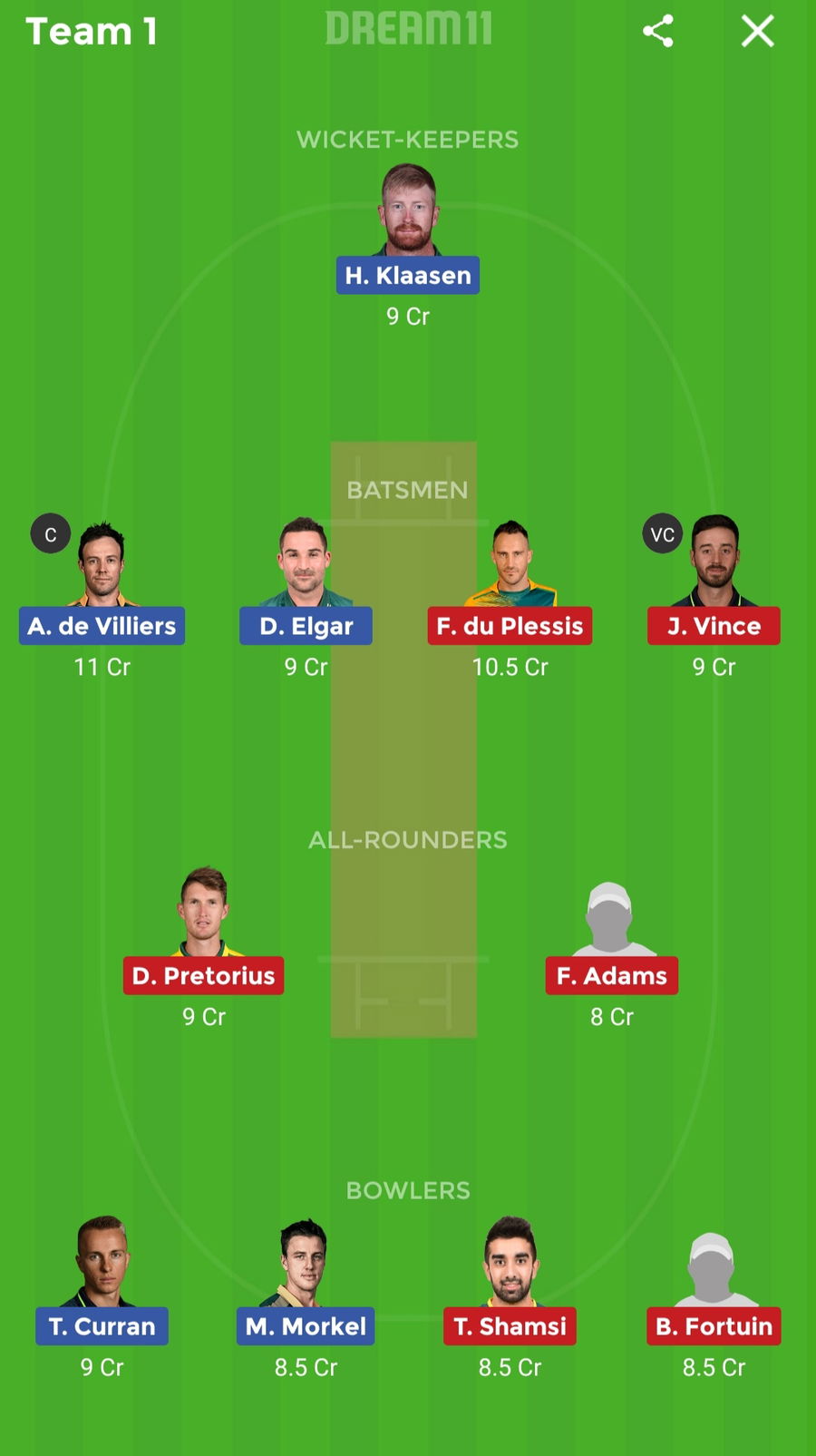Isuru Udana, Henry Davids, James Vince, Faf du Plessis (C), Cameron Delport, Sibonelo Makhanya, Tabraiz Shamsi, Ferisco Adams, Bjorn Fortuin, Kyle Verreynne (WK), Kerwin Mungroo