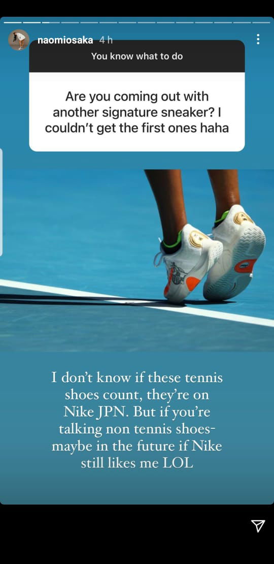 “I don’t know if these tennis shoes count, they’re on Nike JPN. But if you’re talking non tennis shoes-maybe in the future if Nike still likes me LOL,” wrote Osaka in her reply.