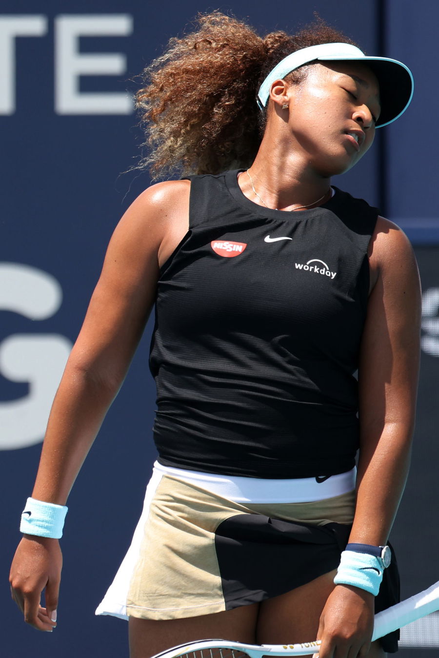 Mar 31, 2021; Miami, Florida, USA; Naomi Osaka of Japan reacts after missing a shot against Maria Sakkari of Greece (not pictured) in a women’s singles quarterfinal in the Miami Open at Hard Rock Stadium. Mandatory Credit: Geoff Burke-USA TODAY Sports