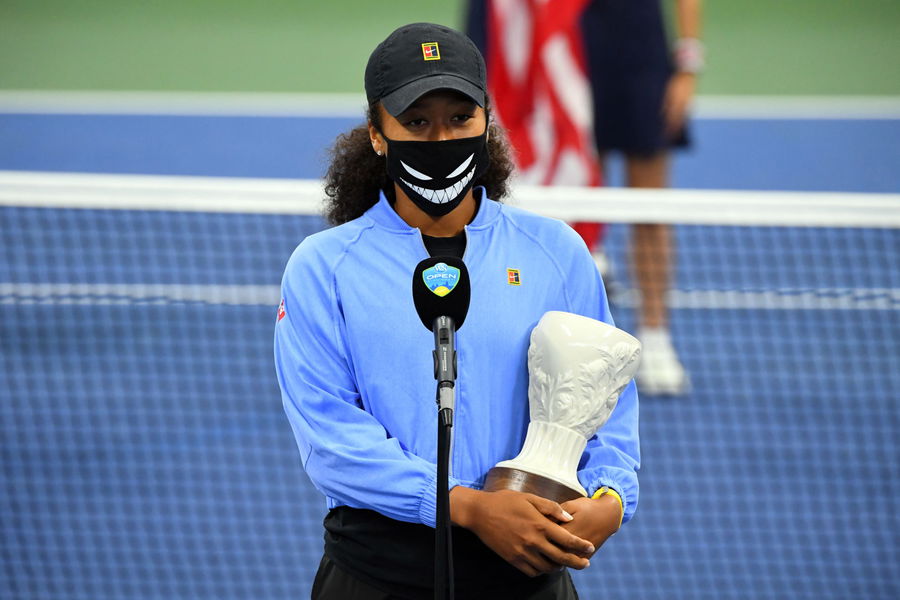Sep 10, 2020; Flushing Meadows, New York, USA; Naomi Osaka of Japan reacts after winning the match against Jennifer Brady of the United States in the women’s singles semifinals match on day eleven of the 2020 U.S. Open tennis tournament at USTA Billie Jean King National Tennis Center. Mandatory Credit: Robert Deutsch-USA TODAY Sports | Reuters