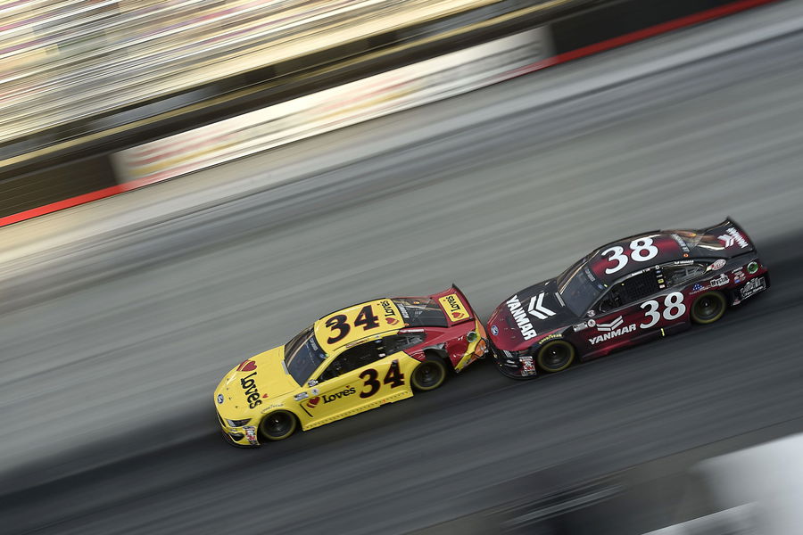 BRISTOL, TENNESSEE – JULY 15: Michael McDowell, driver of the #34 Love’s Travel Stops Ford, races John H. Nemechek, driver of the #38 YANMAR Ford, during the NASCAR Cup Series All-Open at Bristol Motor Speedway on July 15, 2020 in Bristol, Tennessee. (Photo by Jared C. Tilton/Getty Images)