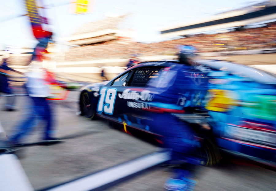 Apr 2, 2023; Richmond, Virginia, USA; NASCAR Cup Series driver Martin Truex Jr. (19) pits during the Toyota Owners 400 at Richmond Raceway. Mandatory Credit: John David Mercer-USA TODAY Sports