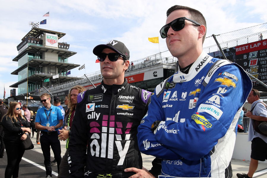 INDIANAPOLIS, INDIANA – SEPTEMBER 07: Alex Bowman, driver of the #88 Nationwide Chevrolet, talks with Jimmie Johnson, driver of the #48 Ally Chevrolet, during qualifying for the Monster Energy NASCAR Cup Series Big Machine Vodka 400 at the Brickyard at Indianapolis Motor Speedway on September 08, 2019 in Indianapolis, Indiana. (Photo by Chris Graythen/Getty Images)