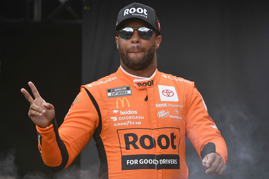 DARLINGTON, SOUTH CAROLINA – SEPTEMBER 04: Bubba Wallace, driver of the #45 ROOT Insurance Toyota, waves to fans as he walks onstage during driver intros prior to the NASCAR Cup Series Cook Out Southern 500 at Darlington Raceway on September 04, 2022, in Darlington, South Carolina. (Photo by Logan Riely/Getty Images)