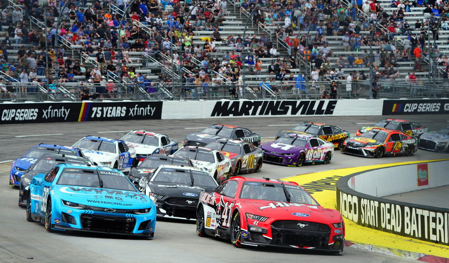 Apr 16, 2023; Martinsville, Virginia, USA; NASCAR Cup Series driver Daniel Suarez (99) and NASCAR Cup Series driver Ryan Preece (41) lead the pack to a restart during the NOCO 400 at Martinsville Speedway. Mandatory Credit: John David Mercer-USA TODAY Sports