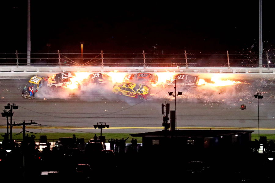 Feb 14, 2021; Daytona Beach, Florida, USA; NASCAR Cup Series drivers Brad Keselowski (2), Kyle Busch (18), Joey Logano (22), Brad Keselowski (2) and Austin Cindric (33) wreck during the Daytona 500 at Daytona International Speedway. Mandatory Credit: Mark J. Rebilas-USA TODAY Sports TPX IMAGES OF THE DAY
