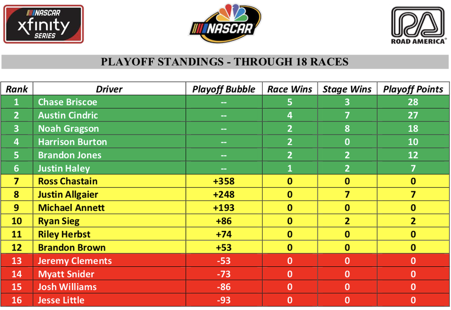 Ross Chastain is 358 points clear in the playoff bubble with Justin Allgaier behind him. Michael Annett, Ryan Sieg, Riley Herbst, and Brown round off the Top-12.